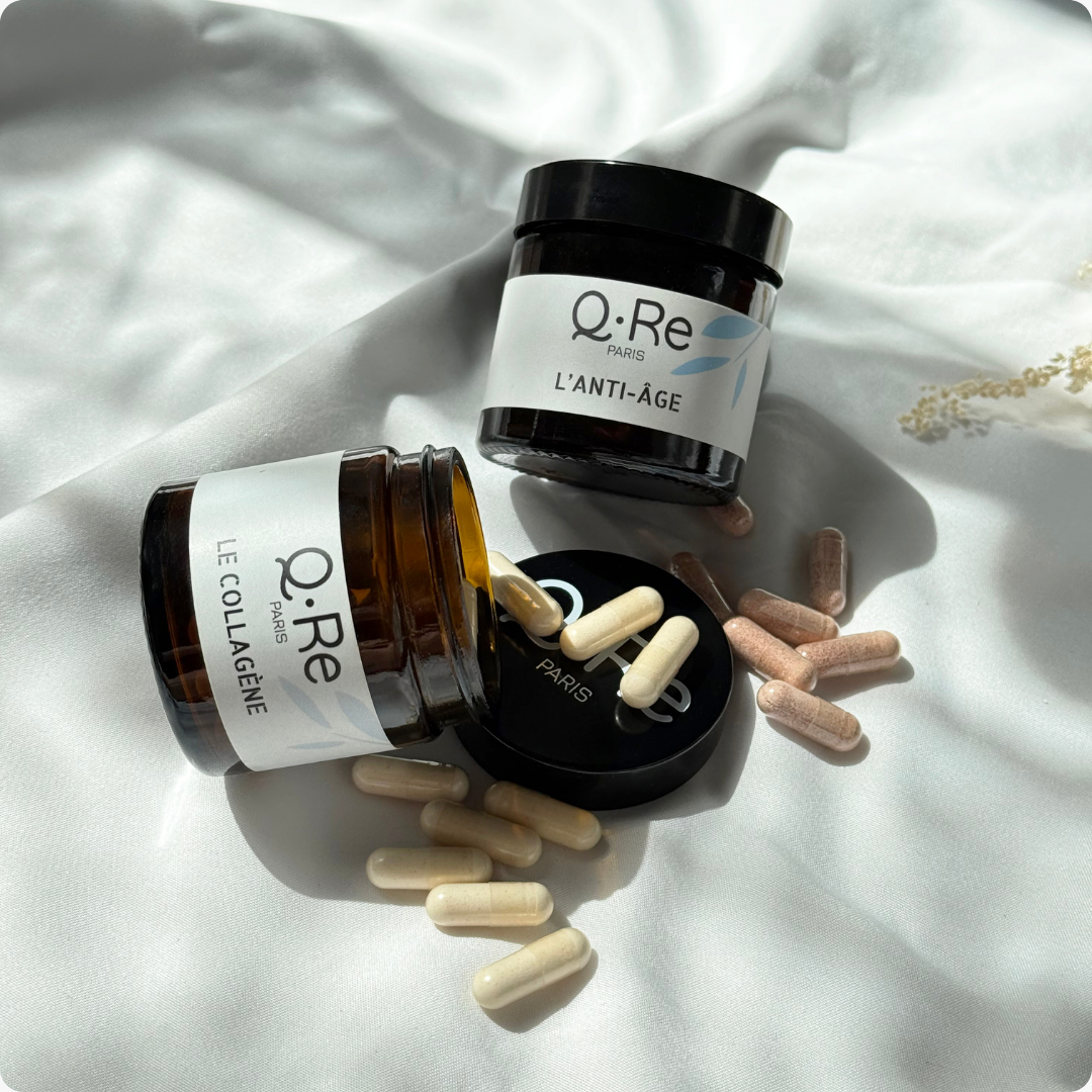 Grâce à notre Q.Re Le Collagène, la production naturelle de collagène est relancée, pour une peau plus ferme, plus élastique et visiblement plus lisse. Q.Re L’Anti-Âge vient renforcer cette action en hydratant en profondeur grâce à l’acide hyaluronique, tout en réduisant rides et ridules, et en ravivant l’éclat du teint.